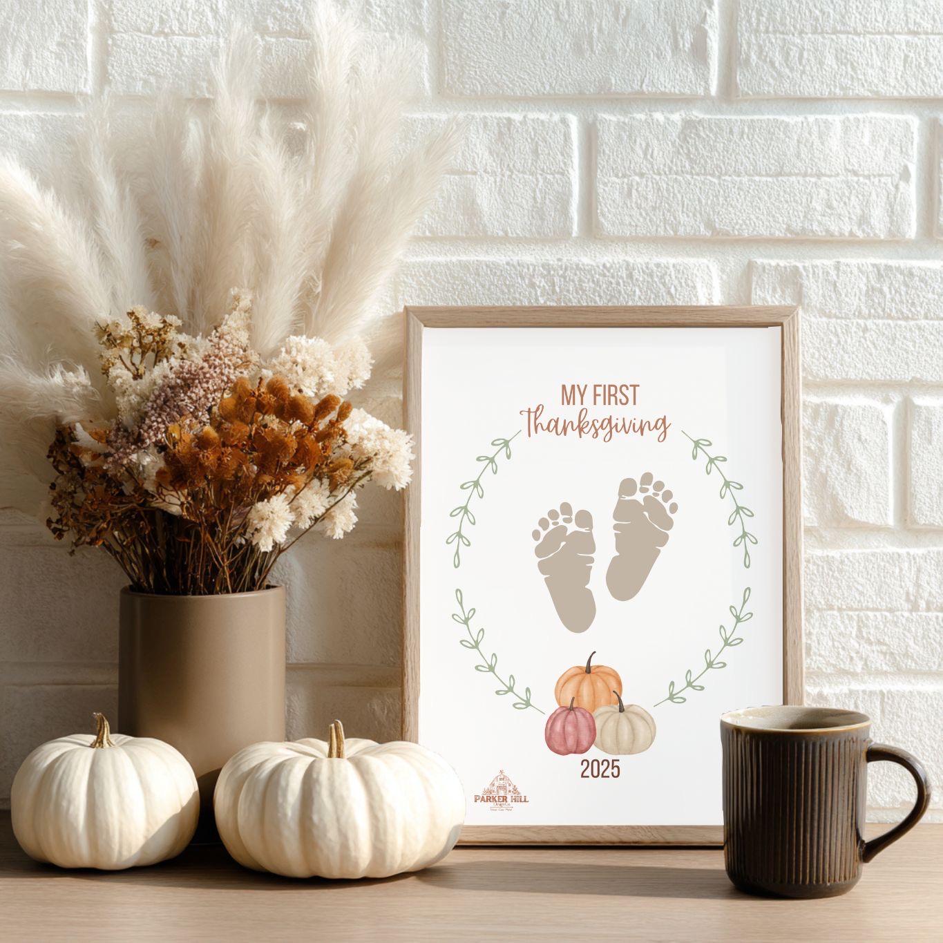 ✨ Celebrate your little one’s very first Thanksgiving with this sweet keepsake printable! Featuring festive pumpkins and “My First Thanksgiving 2025,” this digital download is the perfect way to capture your baby’s tiny footprints and create a treasured holiday memory.