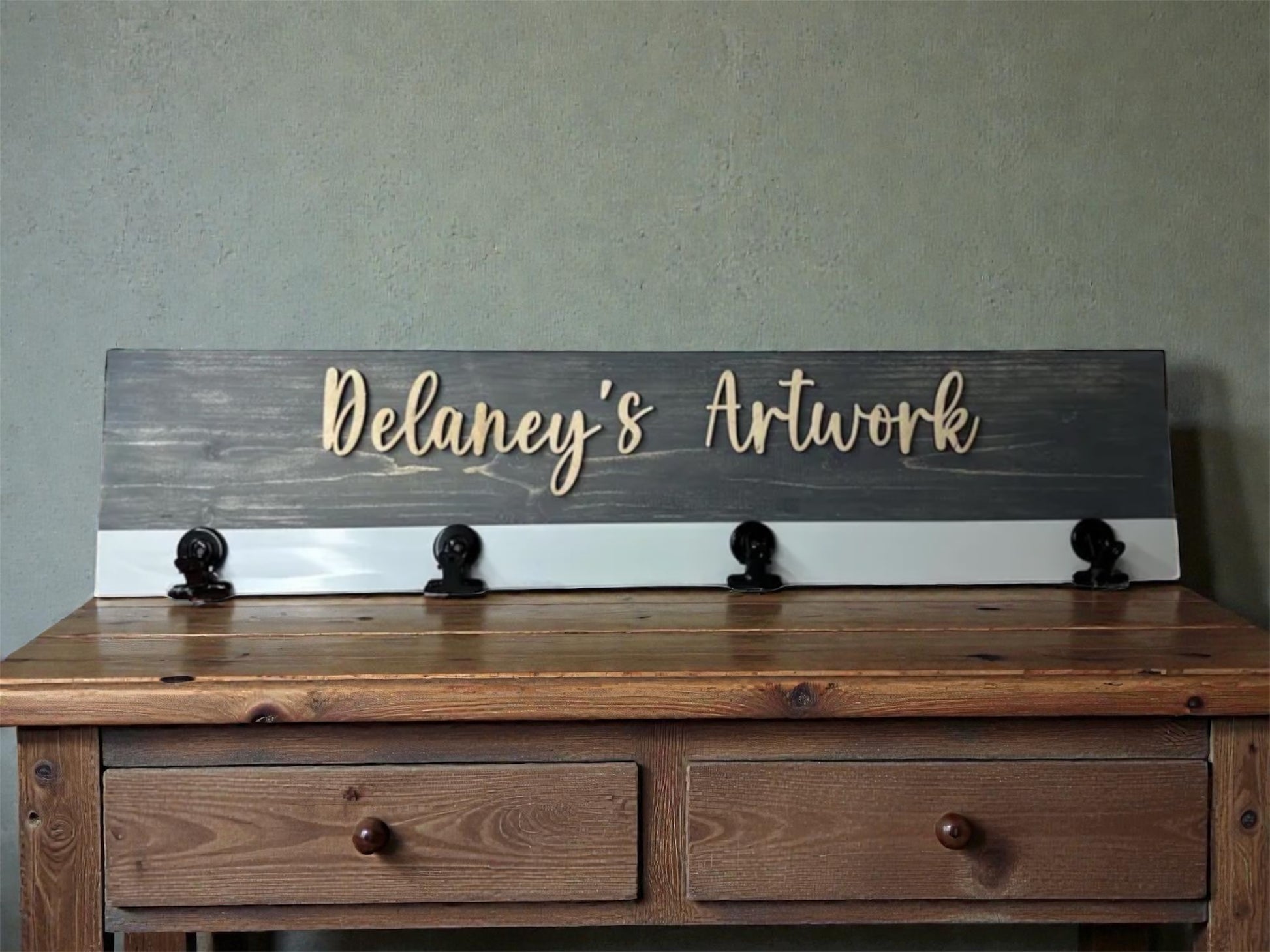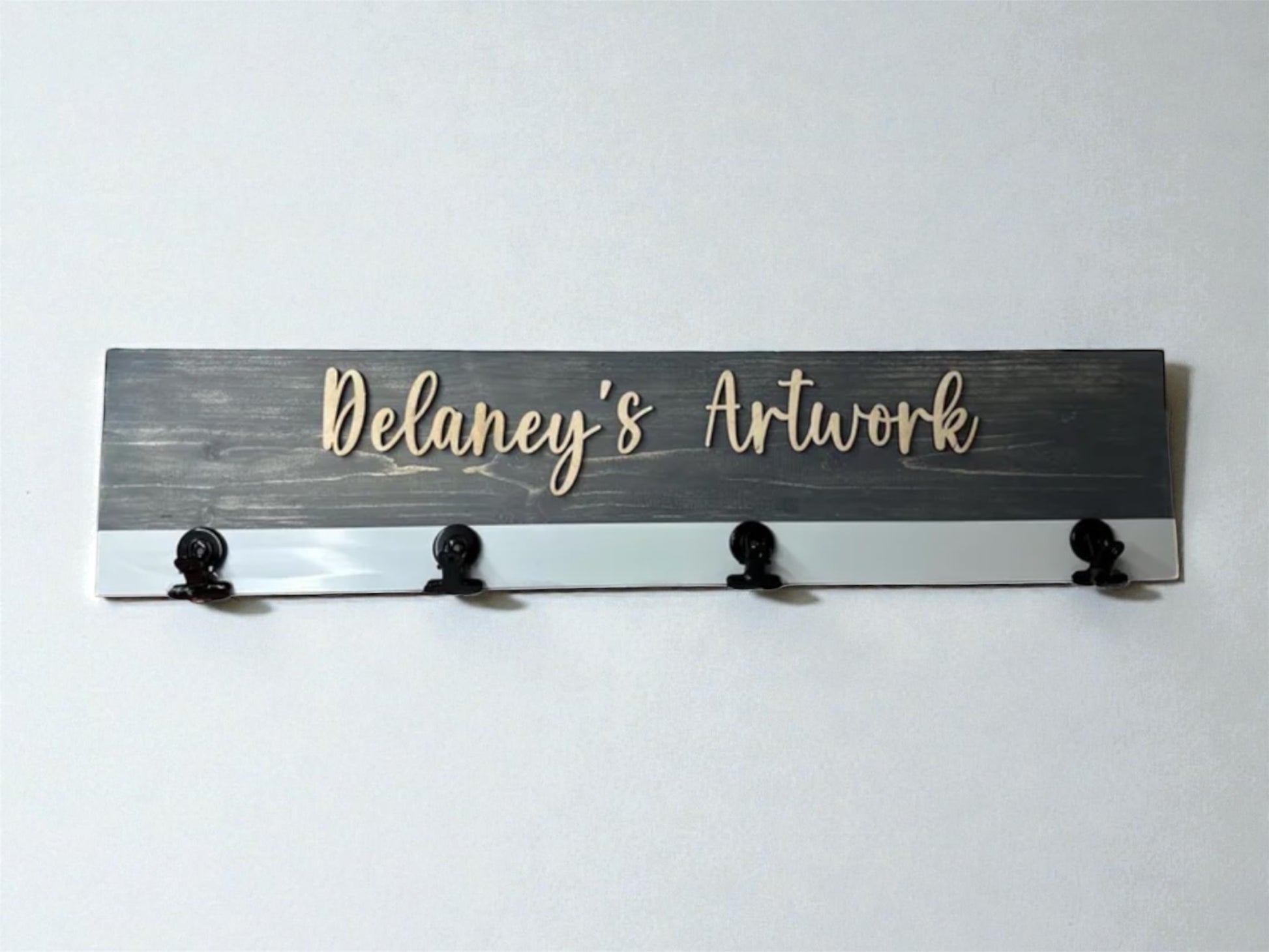 Show off your little artist’s creations with our personalized “Look What I Made” wood display board. Featuring 3D wooden letters and a magnetic strip with clips, it’s perfect for home, classrooms, and playrooms. Now available in a bundle with an extra blank board for more display space!