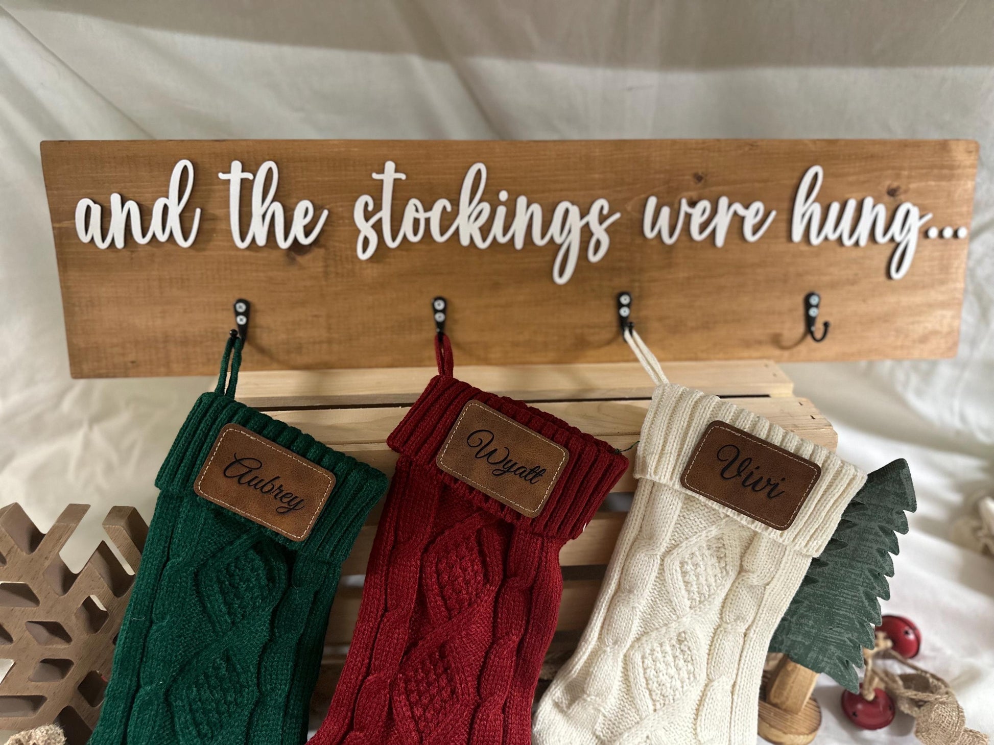 Personalized Knit Christmas Stocking • Engraved Faux Leather Name Patch