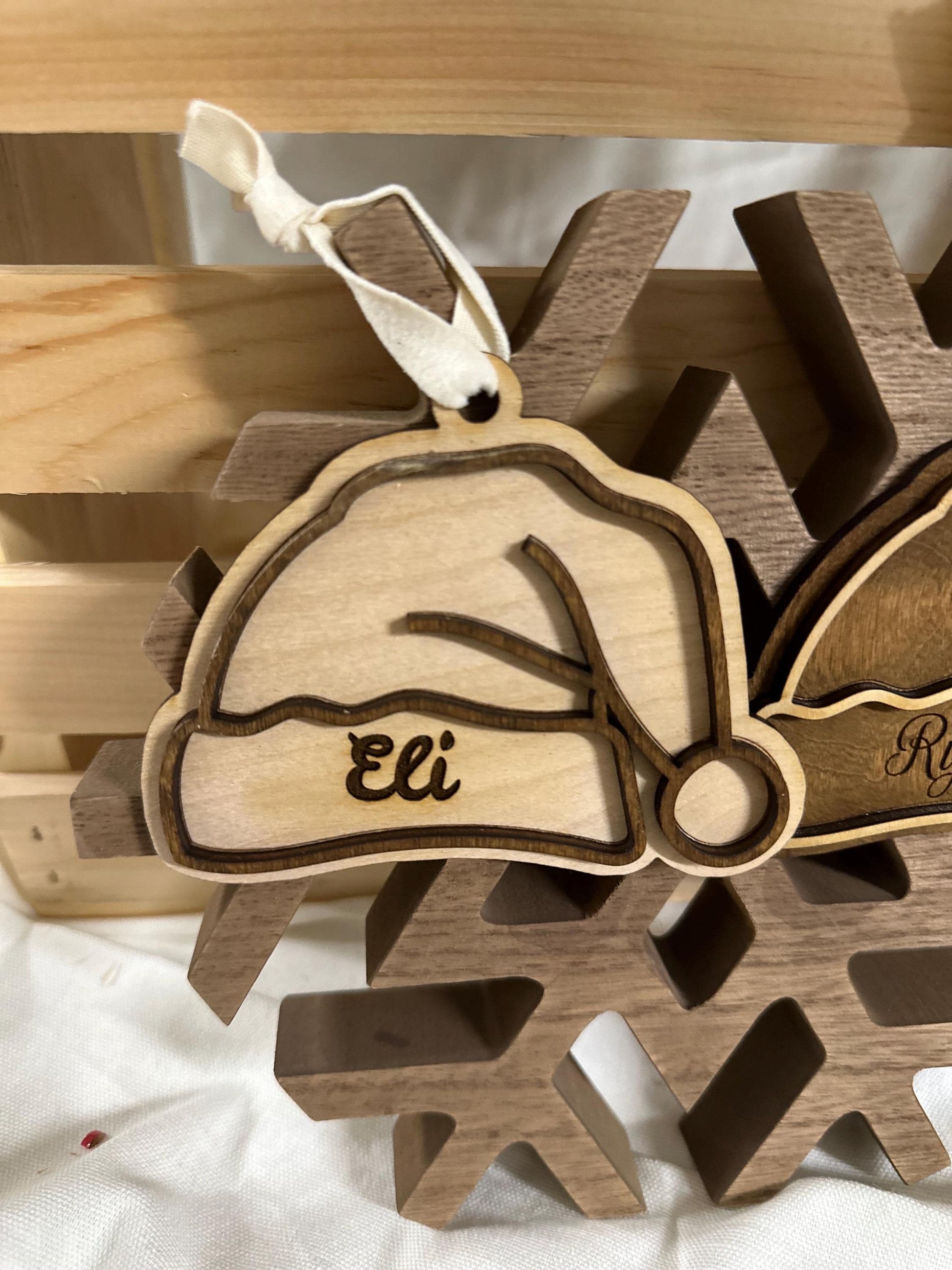 Make your holiday décor extra special with these personalized wooden Santa hat ornaments! Each ornament is laser-cut and engraved with your choice of name, then layered for a cozy 3D look. Perfect for hanging on the tree, adding to stockings, or tying onto gifts for a personalized touch.