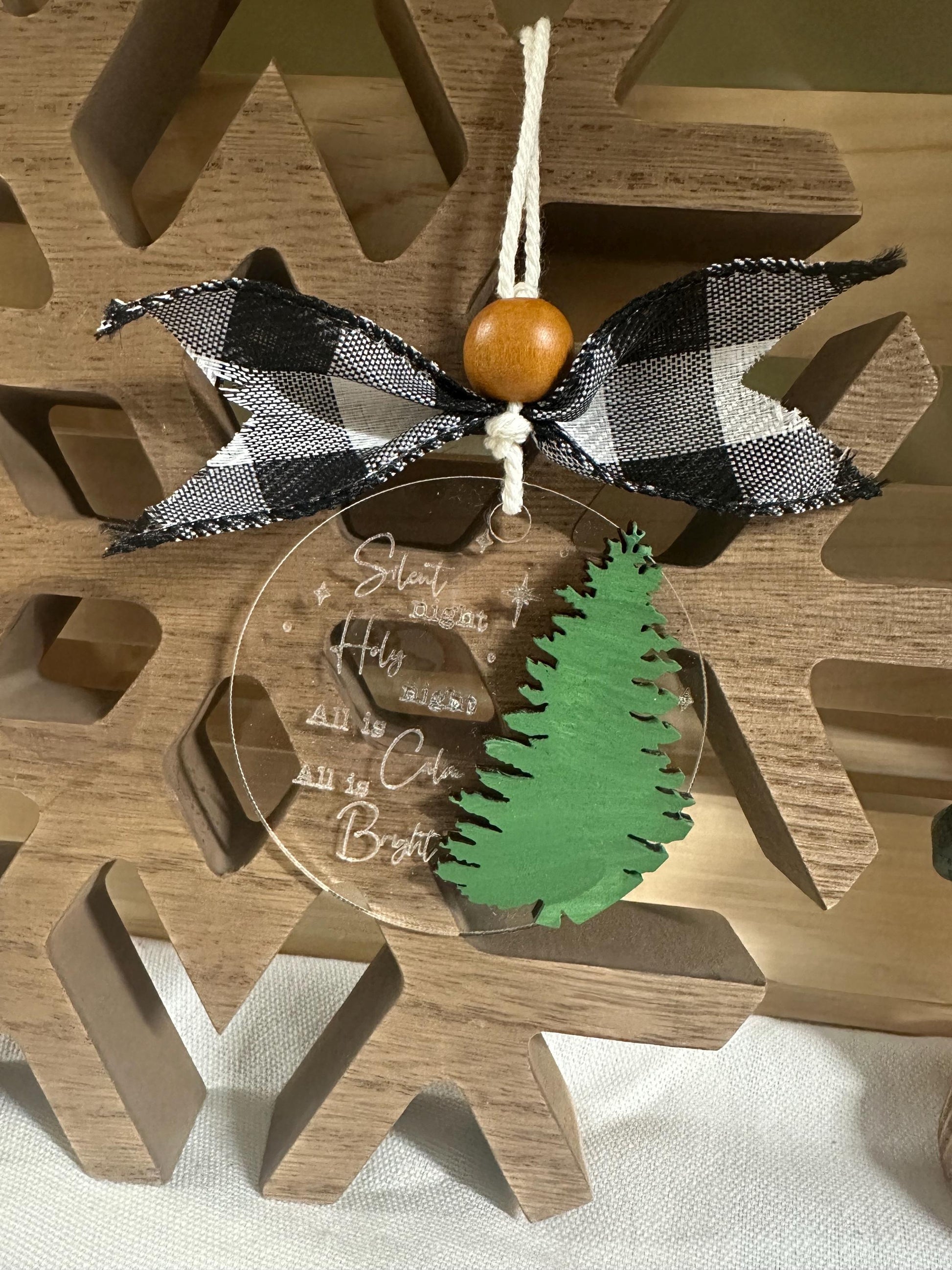 Silent Night Acrylic Christmas Ornament | Buffalo Plaid Bow, Wood Tree